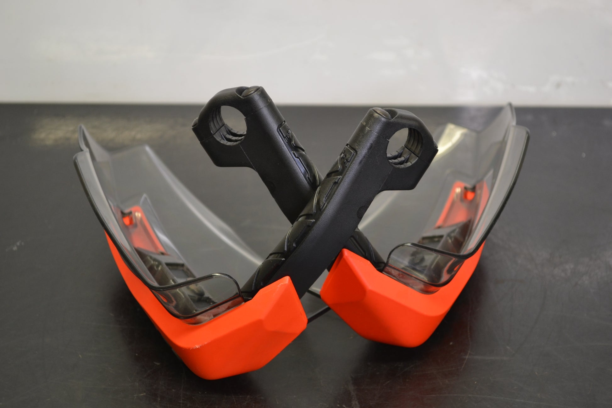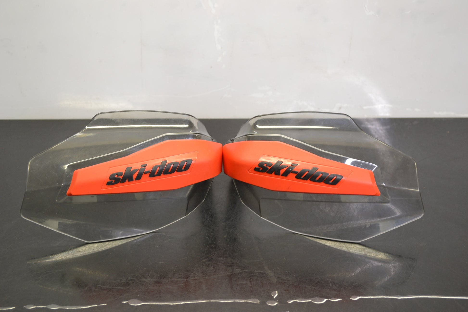 Siistit käytetyt alkuperäiset Ski-Doo käsisuojat. Läpinäkyvät suojat, joissa punertavat keskiosat. Sisältää kaikki kiinnitykseen tarvittavat osat.