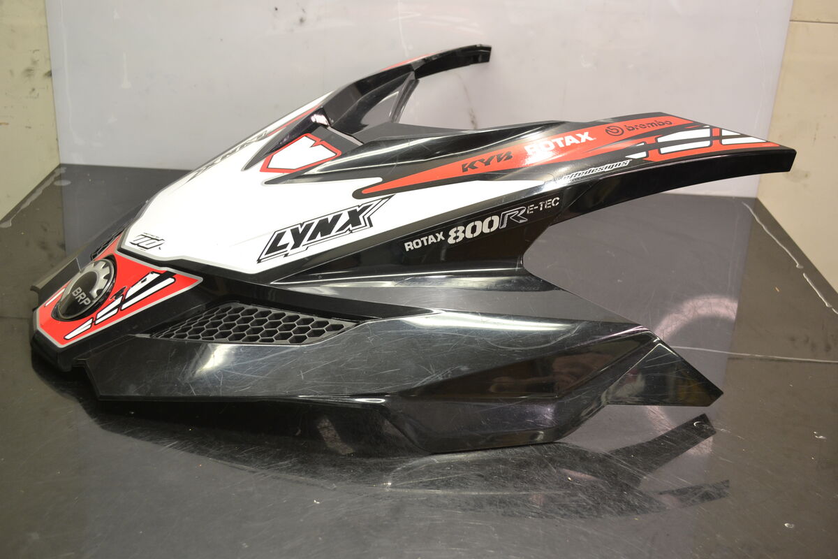 Black 800 Etec hood. One front mount has received minor damage. One crack reinforced. Despite this, it remained firmly in place on the sled. Suitable for Lynx and Ski-Doo snowmobiles 2008-2013.