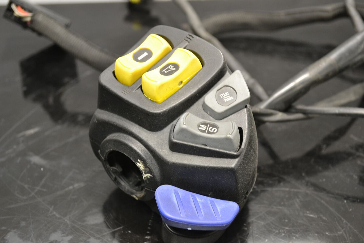 BRP multi-function switch. A working unit except for one of the grip heater buttons, which doesn't stay in place. A good choice for spare parts or to make one working unit from two incomplete ones. Original BRP spare part.