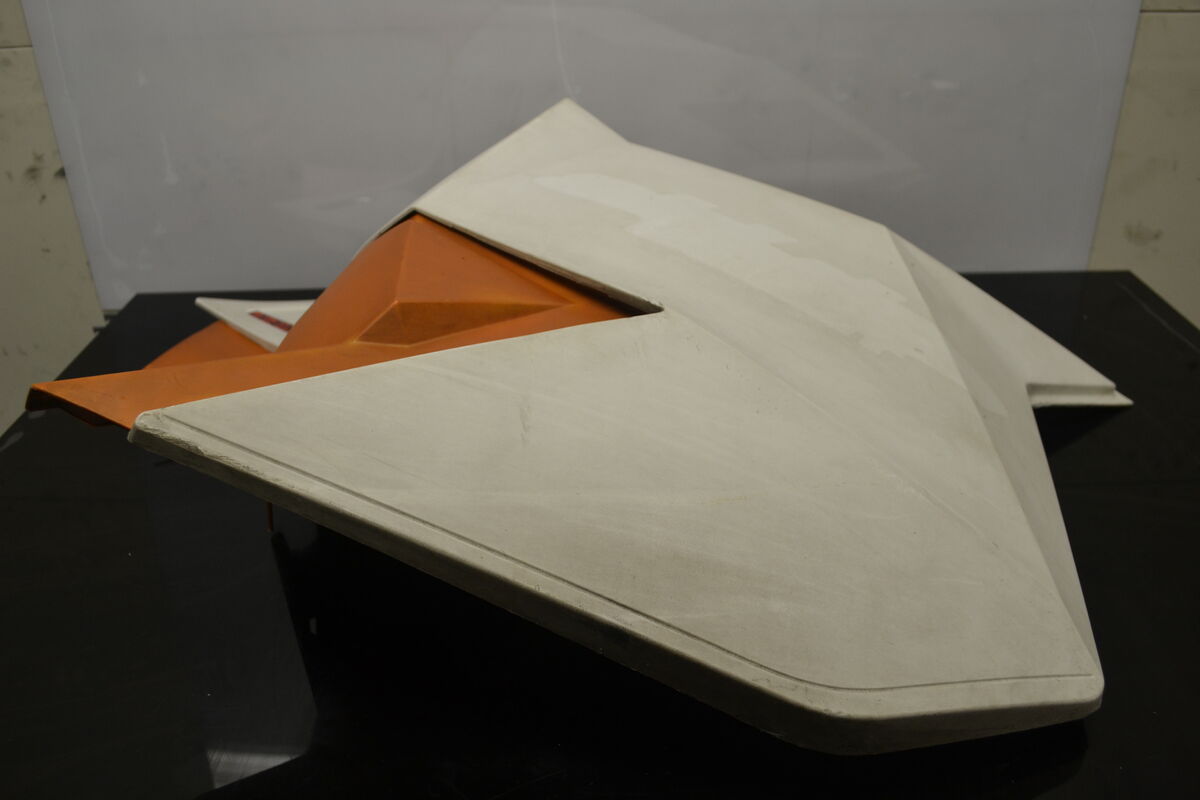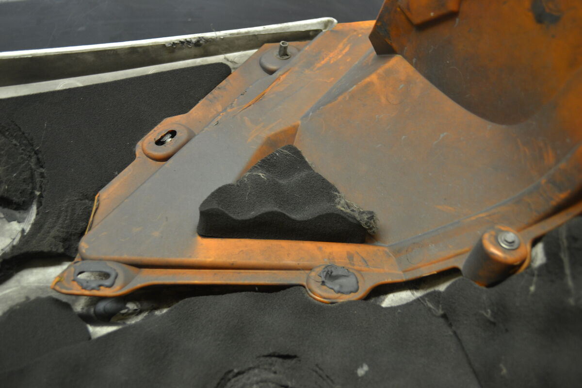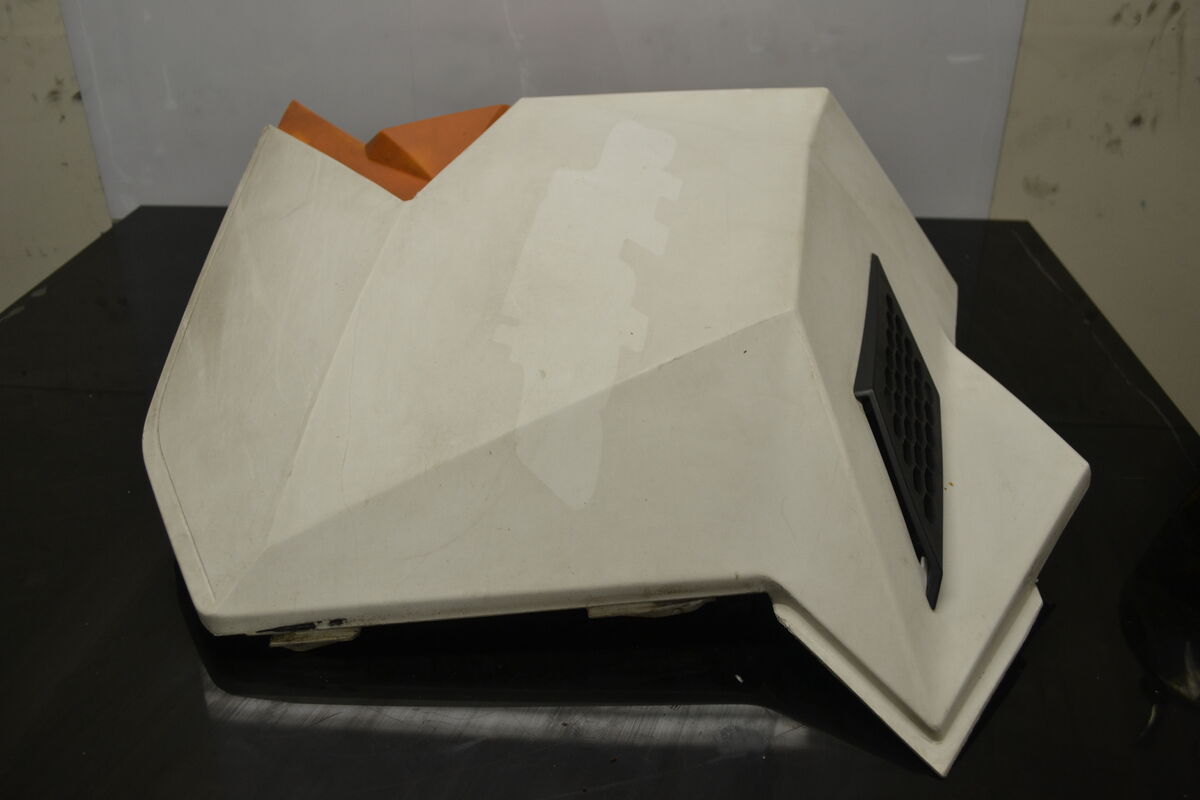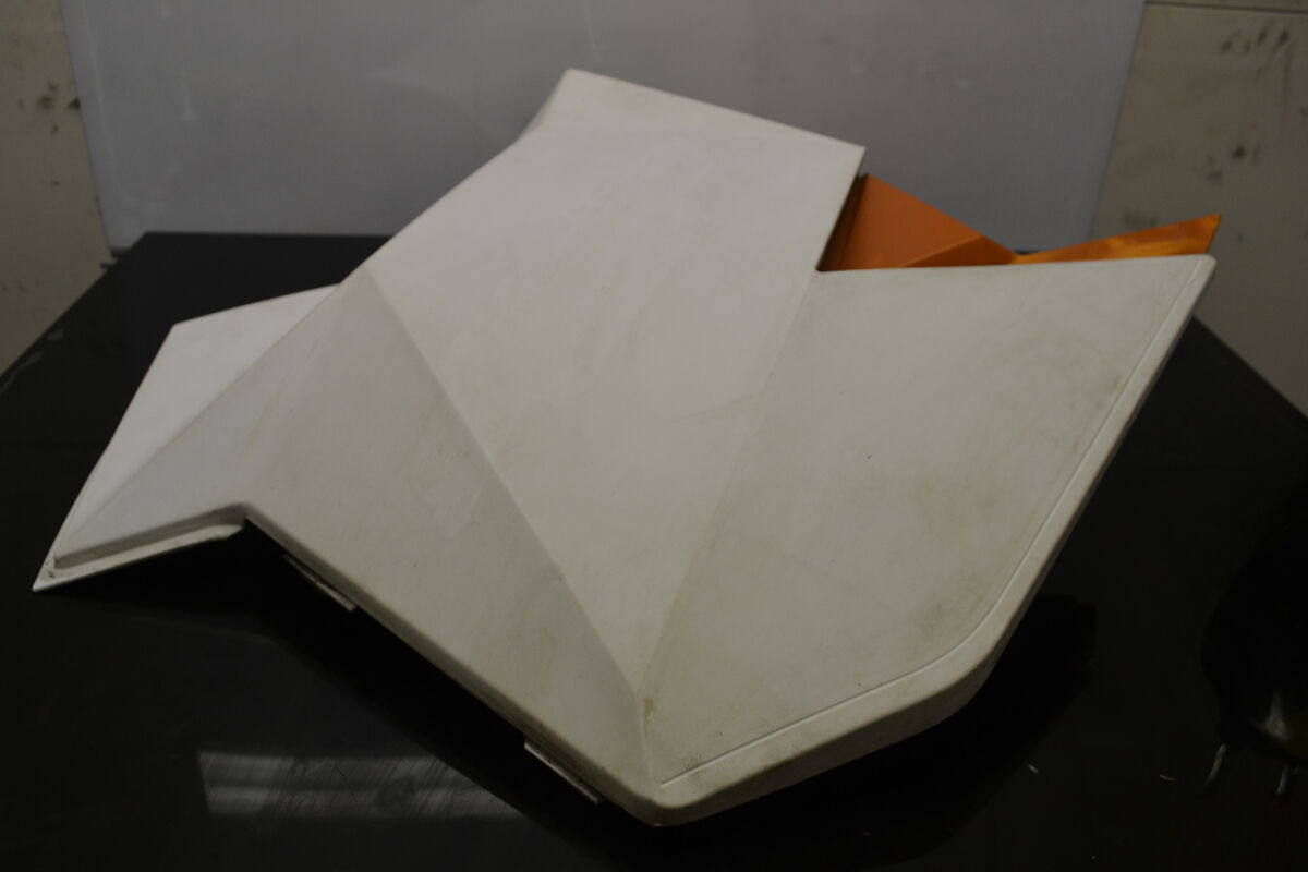 Rarely available Ski-Doo Xp side panels in white/orange. The orange plastic on the clutch-side panel has been repaired, and the clutch has left a mark on the inside, but there are no cracks in the panels. Original BRP part.
