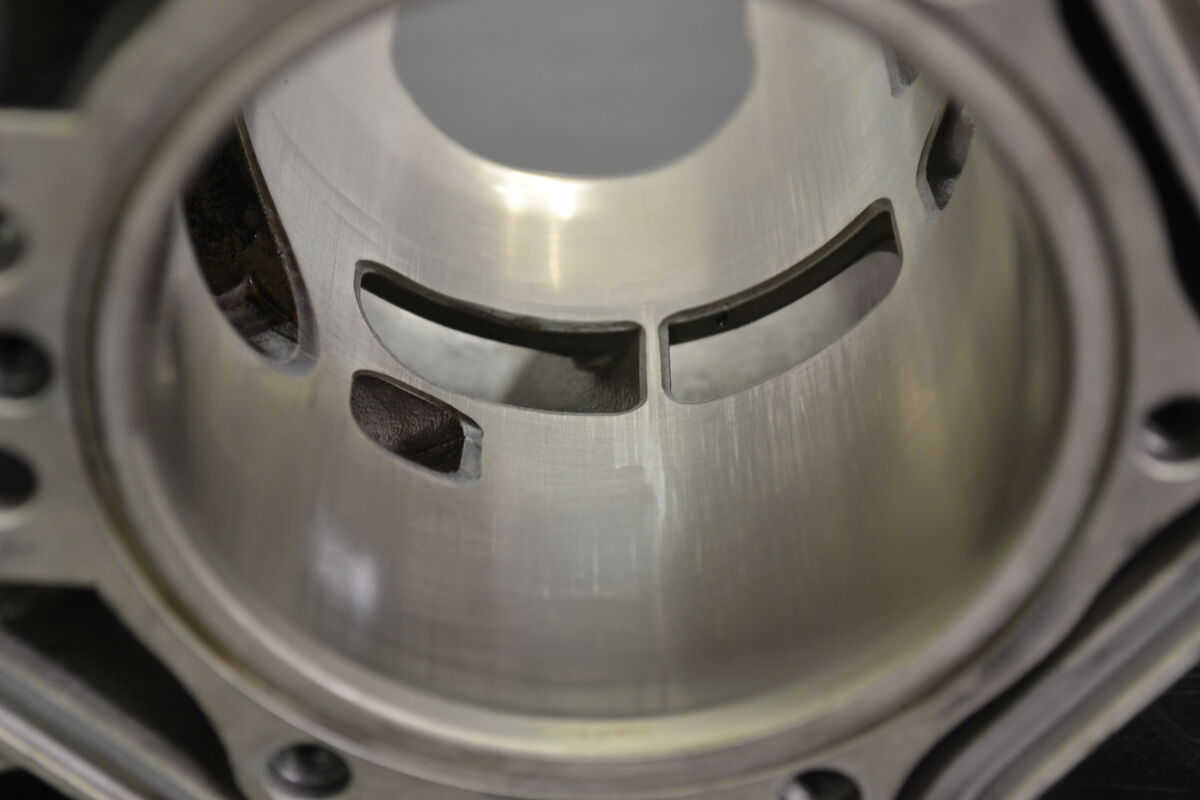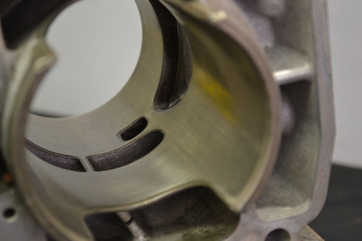 Good condition, used 800 Etec engine cylinder. The cylinder coating shows wear and minor marks. No pieces of the coating are missing. All threads and sealing surfaces are intact. Removed from a working and test-run engine.