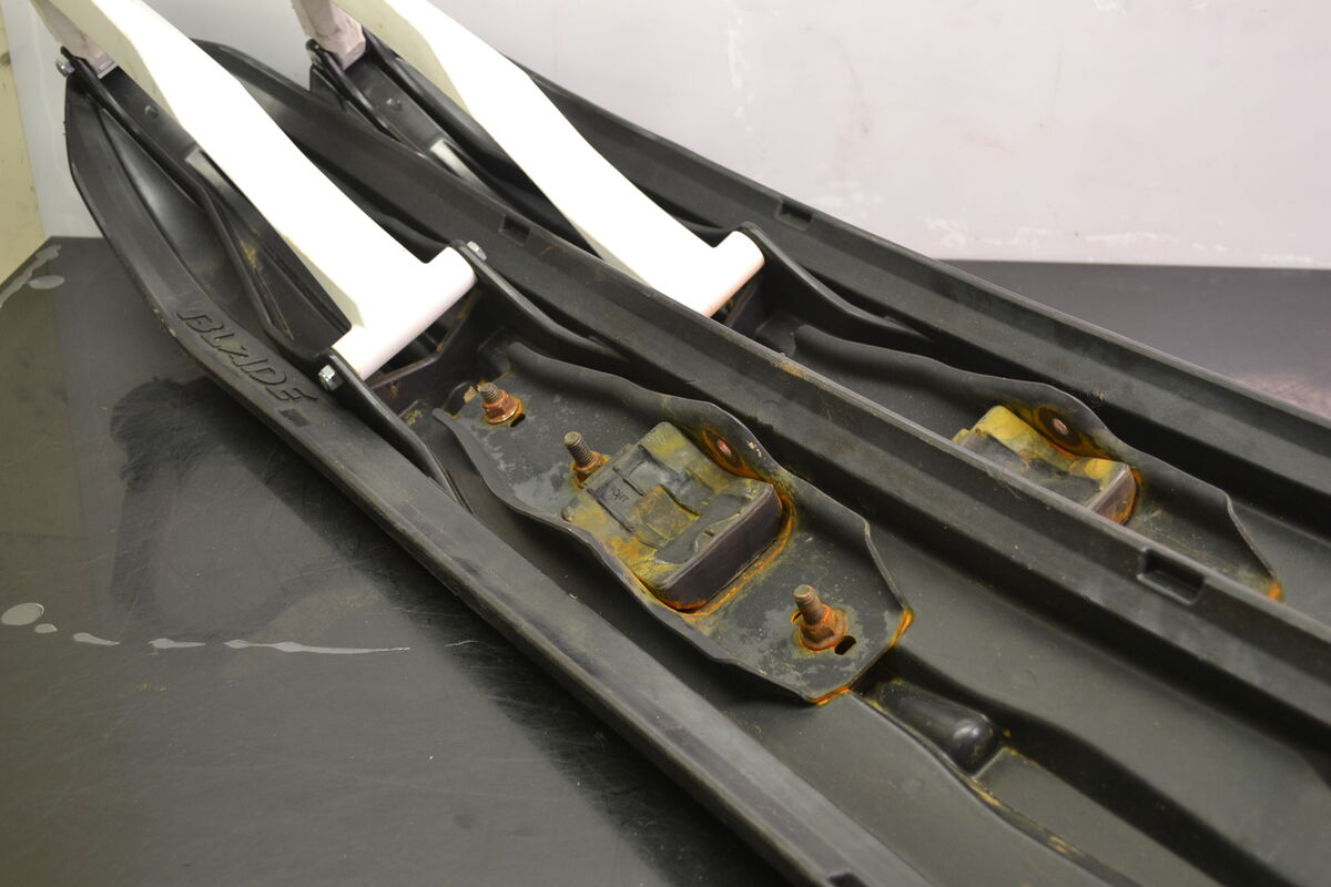 Mustat Blade sukset Brp sovitteilla. Poikkeuksellisen siistit myös pohjista. Ohjainraudat kuluneet. Suosittelemme vaihtamaan ne ennen käyttöä. Todella suosittu ja mukava suksi Lynx ja Ski-Doo kelkkoihin.