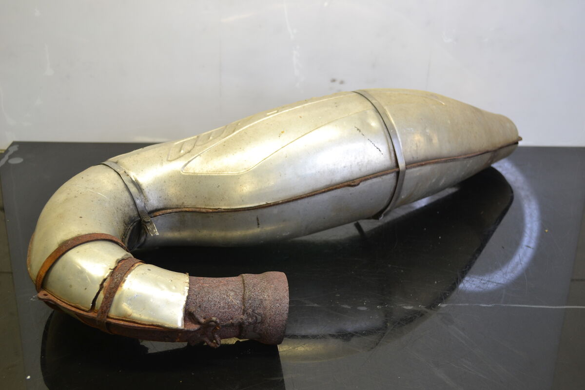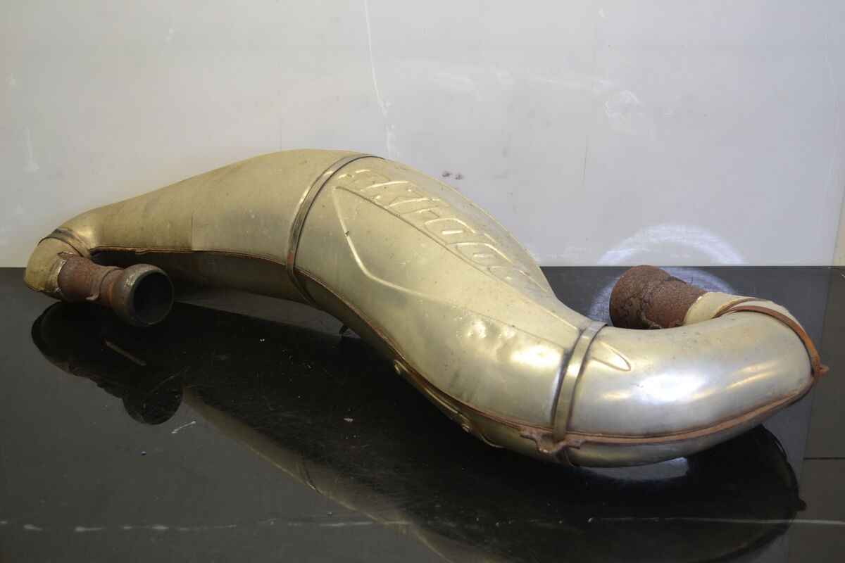 Pakoputki Ski-Doo Mxz 600 1999 kelkasta. Pakoputkessa on käytön tuomaa vikaa ja jälkiä. Pakoputken jouset ovat kuluttaneet kiinnityslenkkejä, Lämpösuojuksissa on sanomista sekä rautaosissa on ruostetta.