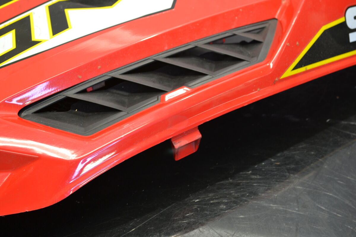 Vasen punainen sivuposki Polaris Indy SP 600 2014 kelkasta. Siistikuntoinen käytetty varaosa. Kaikki kiinnikkeet kunnossa. Muovissa on pieni halkeama ja käytössä tulleita pieniä naarmuja. Paikallaan alkuperäiset Polaris Indy SP 600 2014 kelkan teippaukset.