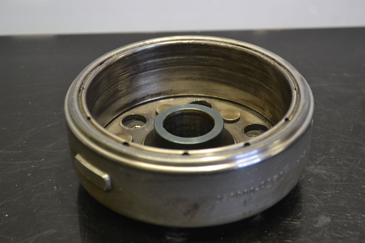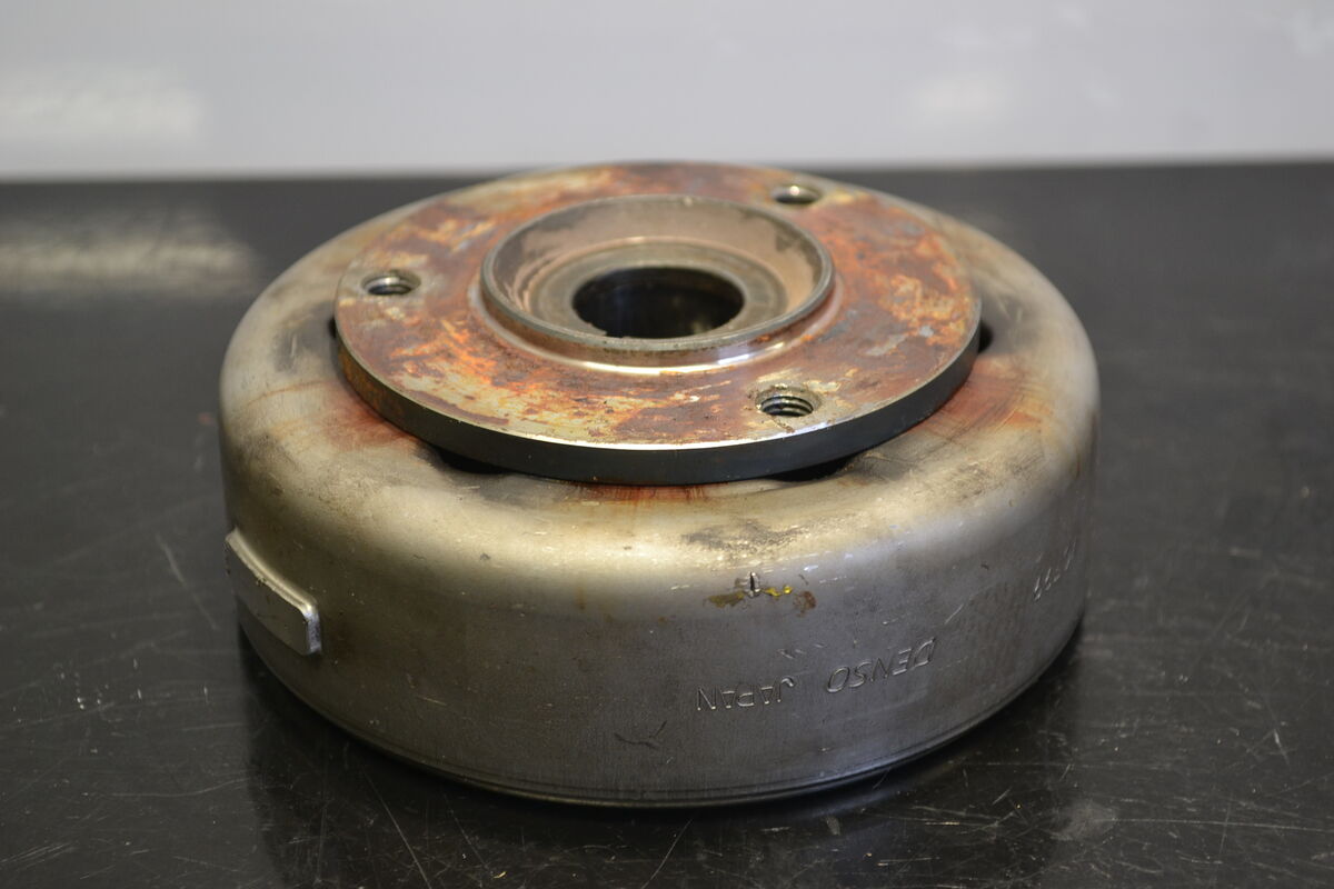 Rotax 593 vauhtipyörä. Purettu Ski-Doo Mxz 600 1999 kelkasta. Osassa on pientä pintaruostetta, mutta ei mitään käyttöä haittaavaa. Magneetit ja kierteet ovat kunnossa.